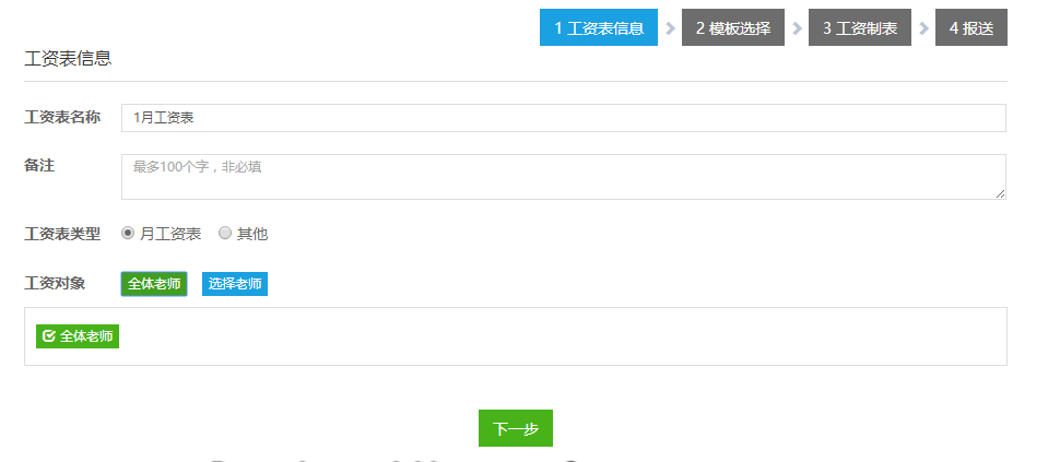 进入【工资表列表】,点击[新建工资表],填写资表的信息。右上方的文字向导能引导我们一步步建立工资表。