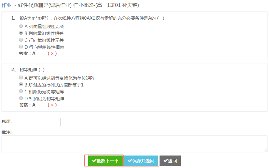 进入学生作业,教师可根据答案批改。批改完成,教师依旧可以对总评以及批注进行修改并保存。