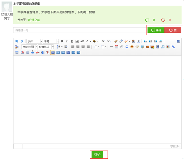 所有人都可以探讨帖子进行评论、点赞,删除自己的评论,取消赞,可快速回复,也可通过文本编辑器回复。