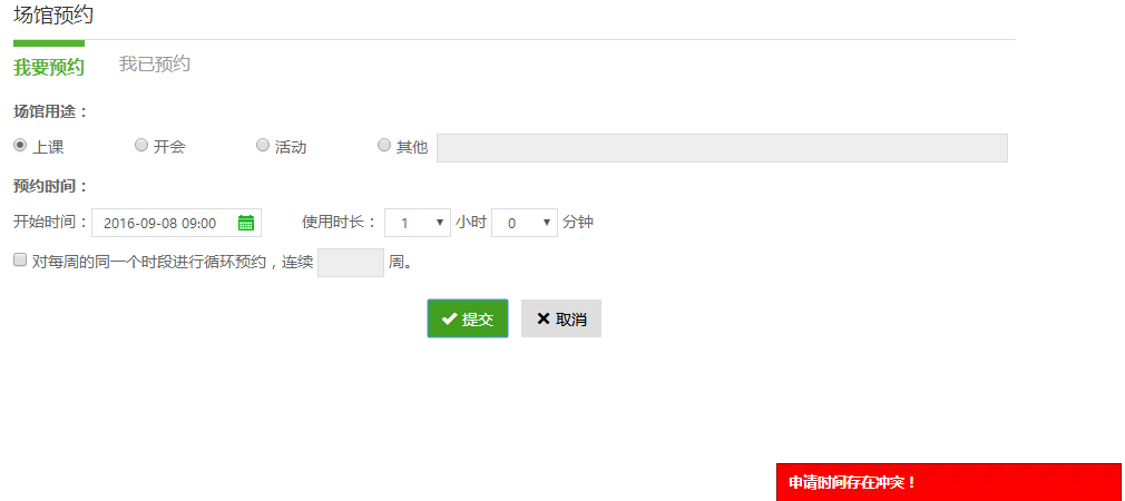 填写预约信息,选择场馆用途,如果没有老师需要的选项,可选择其他,并注明用途。填写预约时间,填好进行提交,必要的话可勾选循环预约,则可以在多个周次的同一时间对此场馆进行预约。